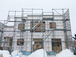 構造用合板が張り終わってから、付加断熱をしていきます。