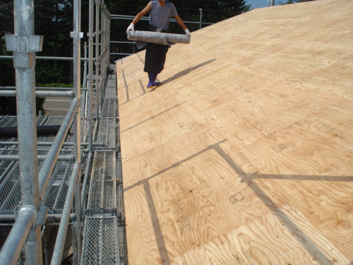 屋根合板が張り終わり、ルーフィングという防水紙を貼ります。