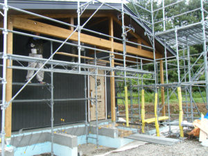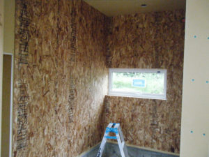 工具などを掛けられるよう、一部に有孔ボードも張っていきます。