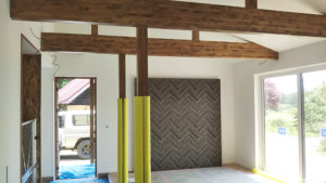 クロスが貼り終わると、パッと空間が明るくなりました。 テレビを壁掛けするリビングの壁を一部造作し、 ヘリンボーン柄のアクセントクロスを貼っています。