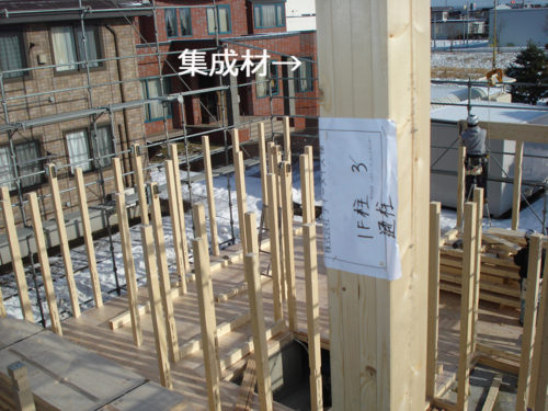 構造材は集成材という一般的な無垢の製材よりも強度の強い材料を使います。