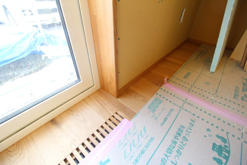 窓枠、幅木、床ガラリなど合わせて無垢材で統一しています。