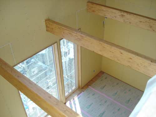 ご夫婦のリビングの梁は、ナラの無垢フローリングに合わせて塗りました。