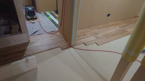 ↓階段が終了し、一階の無垢のフローリングが貼られていきます。