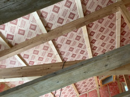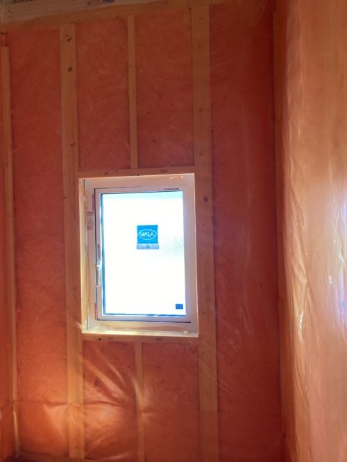 壁の断熱材も入れ終わり、気密シートが貼られていきます。