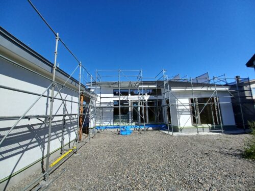 S様邸の外部は塗り壁の下地の処理を行なっています