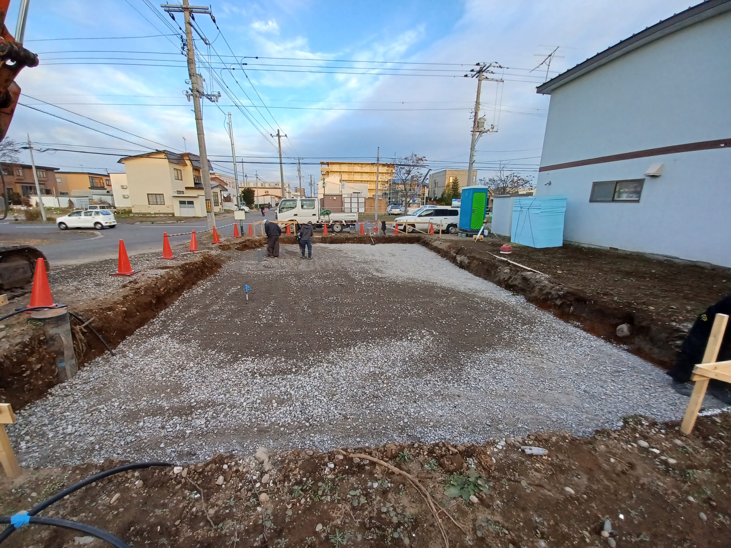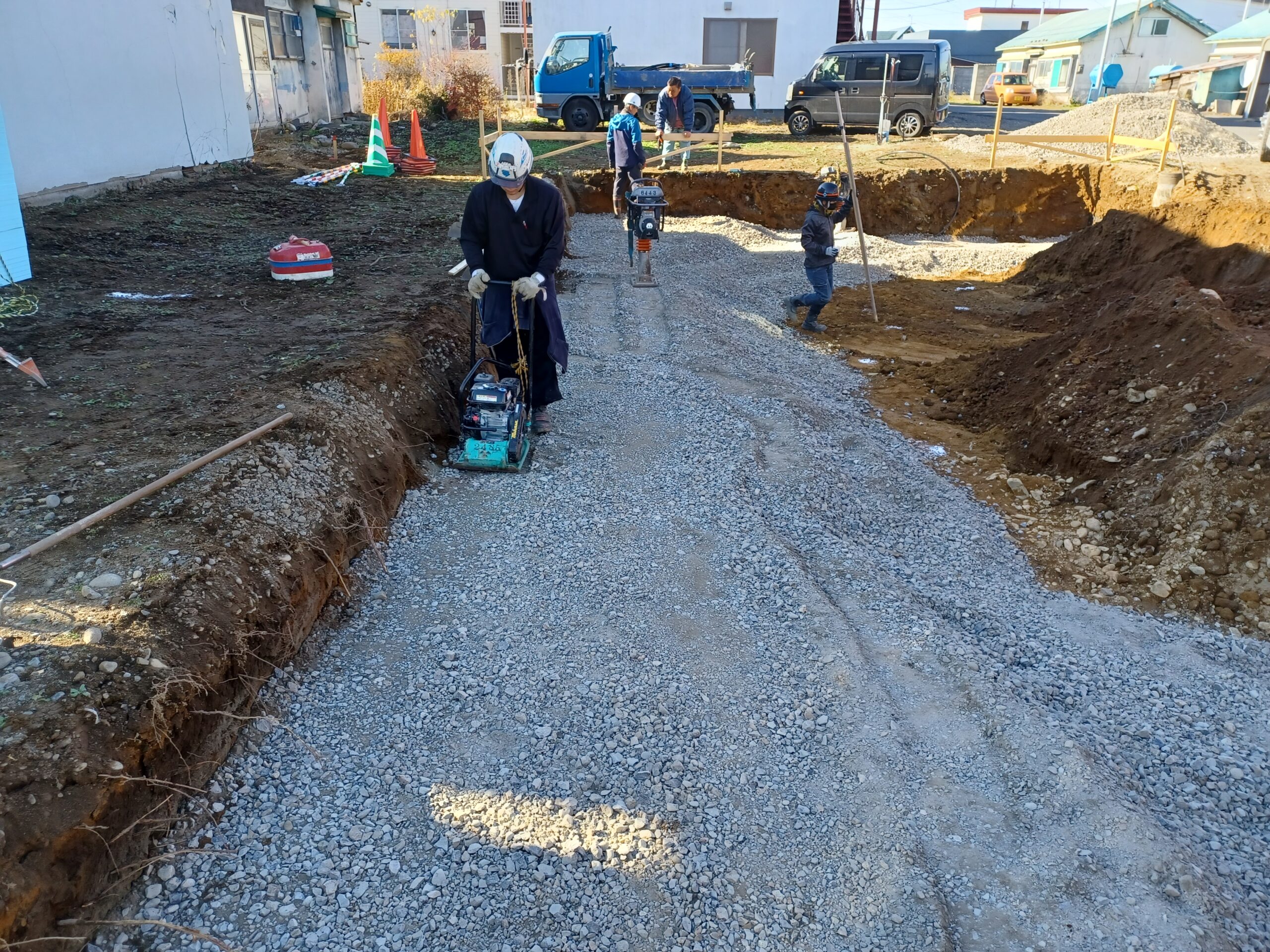 朝から行い夕方までに基礎の下部分になる砂利入れ迄終了しました。