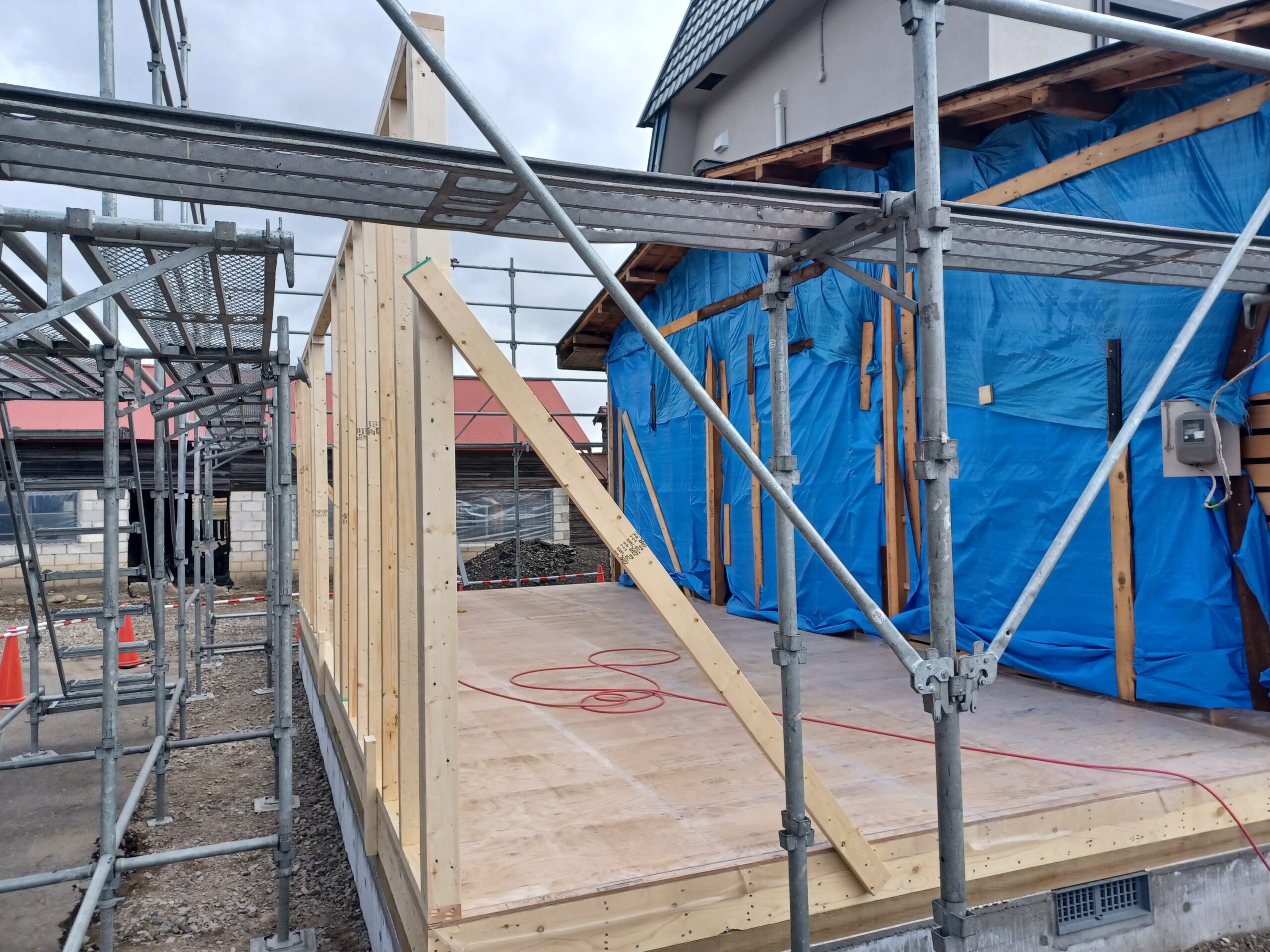 既存建物の床の高さを確認、調整しながら骨組みを作っています。