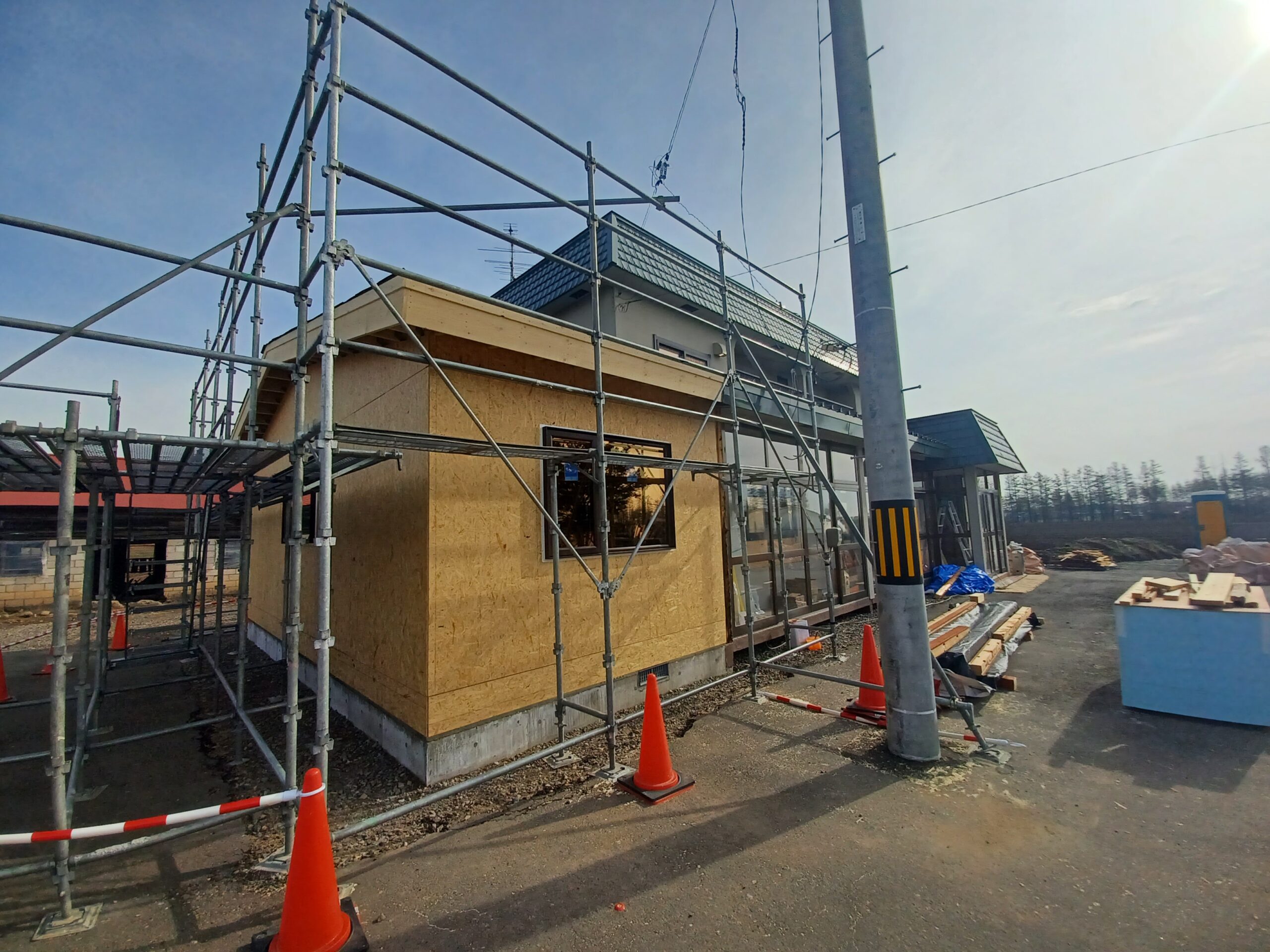 屋根や壁の合板貼りが進むと建物の形が良く判るようになります。