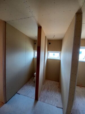 天井、壁の石膏ボード貼りが進むと