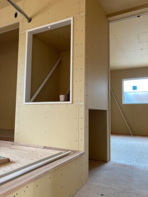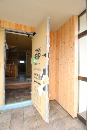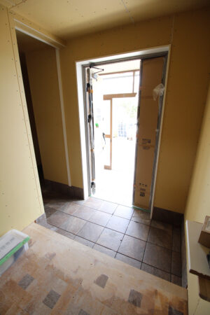 石膏ボード貼りが終わり、ドア枠も取り付けられていました。