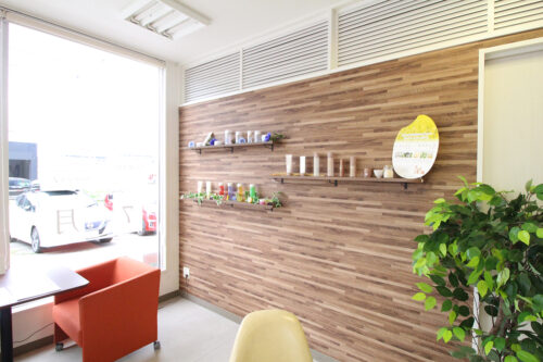 店舗の壁一面を張り替えたクロスを、アクセントに使っています。