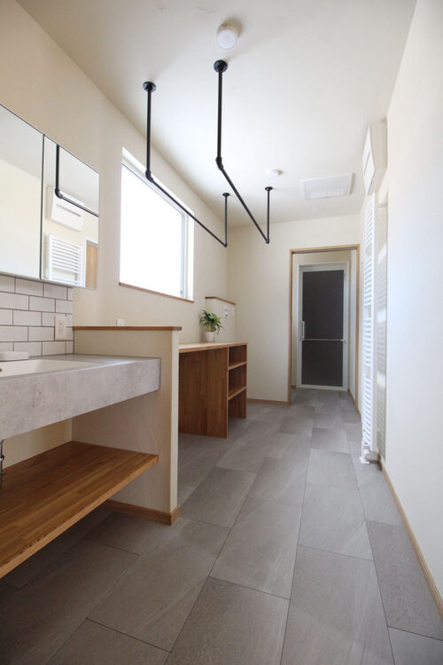 手前から洗面台、ランドリースペース、そして奥に脱衣室があります。