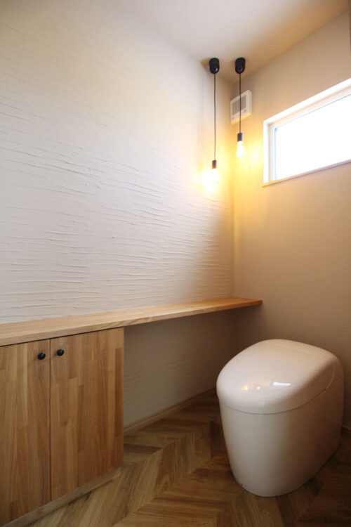 トイレの一面は塗り壁の塗り方を変えています。