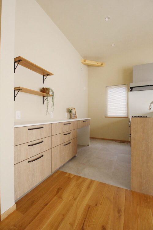 カップボードの上には、小物が飾れる飾り棚を設けました。