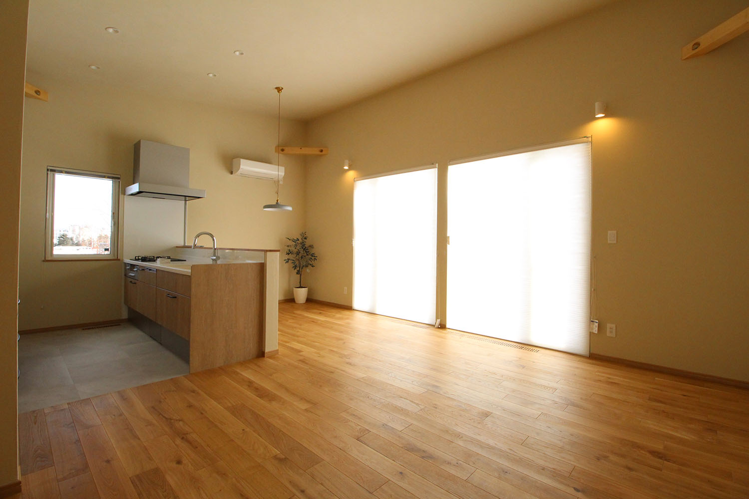 ナラ無垢のフローリングと、壁・天井共に塗り壁で仕上げた内装が