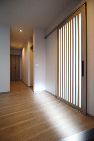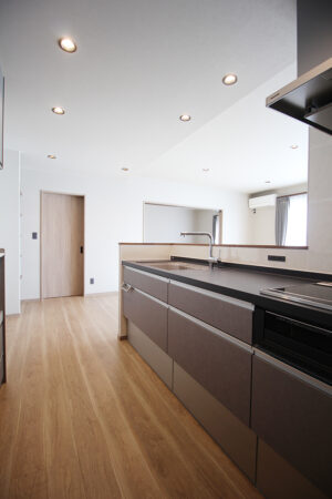 奥に進むと洗面脱衣室、キッチンへとつながる回遊式の動線プランです。