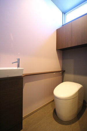 ティーメイス標準仕様の塗り壁(ビオシェル)で仕上げた落ち着きのある外観。