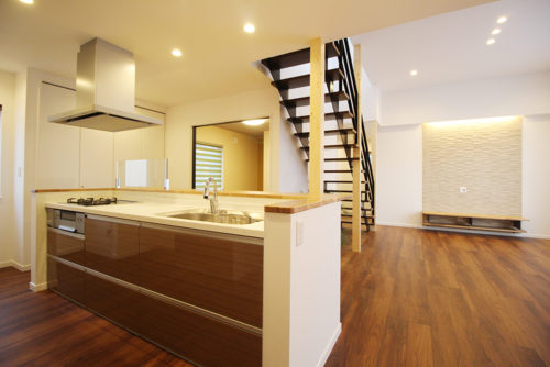 ぐるぐるまわれる回遊式で、キッチン後ろには食器棚、