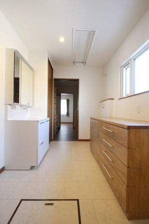 洗面脱衣室で乾かした洗濯物は、造作収納の上で畳んで