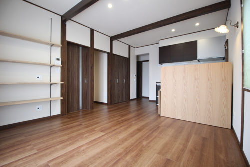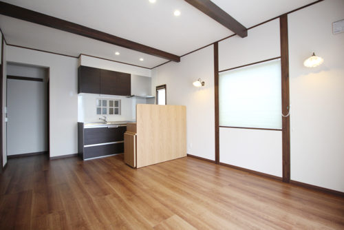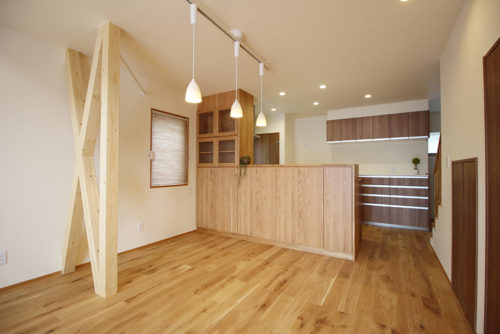 真壁風に付柱や梁を見せ、古民家風の落ち着いた空間の親世帯様リビング。