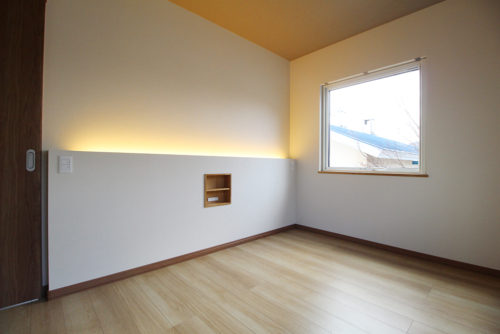 ベッドのヘッドボード側に腰壁を造作し間接照明を施しました。