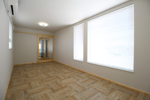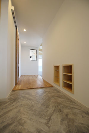 玄関には細長いフロアタイルをヘリンボーン柄に貼りました。
