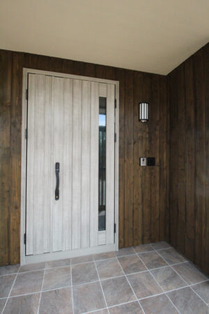 玄関ドアの周りにはアクセントにカラマツの羽目板を貼りました。