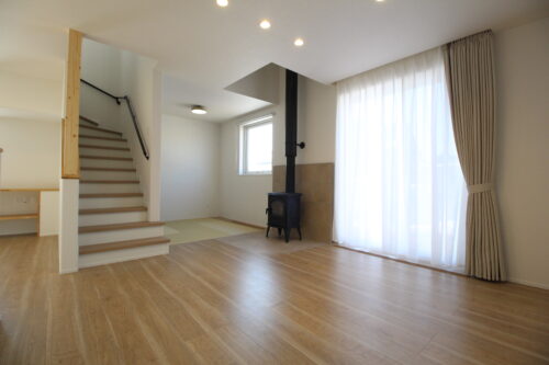【新築施工例】かわいらしい薪ストーブのあるナチュラルインテリアのお家