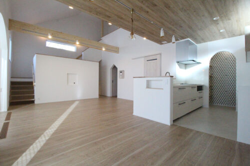【帯広市 新築施工例】勾配天井の開放的なリビングのある平屋住宅